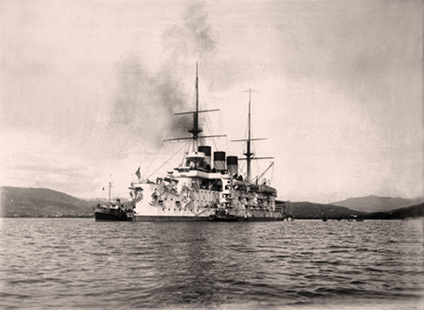 _LA FOTO SOTTO, PROBABILMENTE DATATA VENERDÌ 9 OTTOBRE 1903, È STATA SCATTATA IN OCCASIONE DELLA VISITA DI VITTORIO EMANUELE III AL VICE-AMMIRAGLIO RUSSO ANDREI ANDREYEVICH WIRENIUS COMANDANTE DELL’OSLJABJA ORMEGGIATA IN RADA ALLA SPEZIA. L’UNITÀ ERA IN ATTESA DI ENTRARE IN ARSENALE PER URGENTI LAVORI DI BACINO PER DANNI RIPORTATI IN CHIGLIA DOVUTI AD UN INCAGLIO SU BASSO FONDALE OCCORSO POCHI MESI PRIMA DURANTE L’ATTRAVERSAMENTO DELLO STRETTO DI GIBILTERRA.