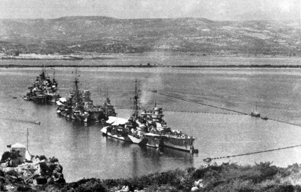 (From front to rear: the cruiser Garibaldi with the destroyer Alpino on her starboard side; the Duca d'Aosta between the destroyers Corazziere and Mitragliere; and the Duca degli Abruzzi with the destroyer Bersagliere on her port side).