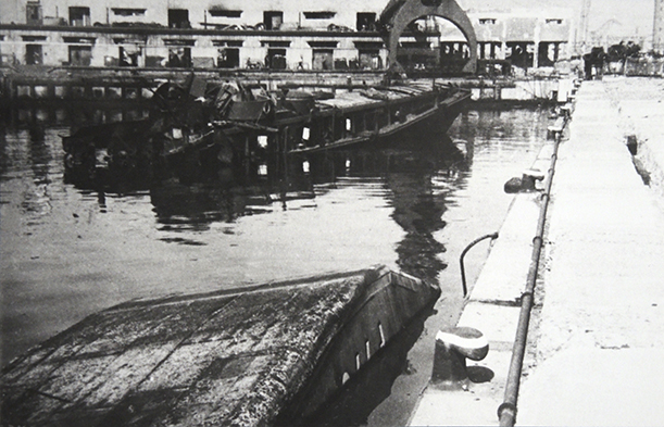 NELLA FOTO UNA MOTOZATTERA TEDESCA SEMIAFFONDATA AL PONTE ETIOPIA E IN SECONDO PIANO ALTRI DUE MZ.