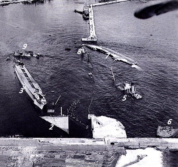 UNA ELOQUENTE IMMAGINE DELL’IMBOCCATURA DI LEVANTE DEL PORTO NEGLI ULTIMI GIORNI DI APRILE 1945.