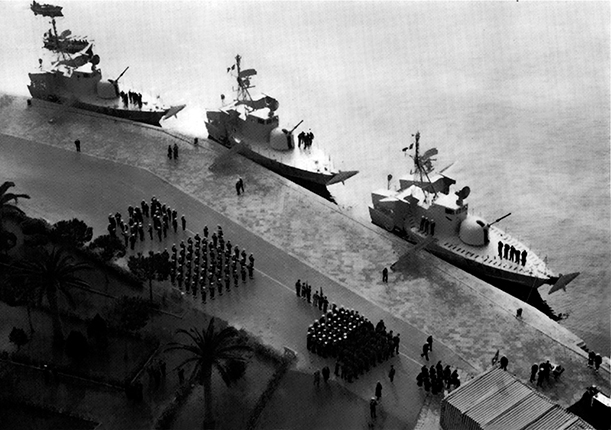 L’immagine ritrae la cerimonia della consegna della bandiera di combattimento, offerta dalla sezione A.N.M.I di Brindisi, alla Squadriglia Aliscafi (Sparviero - P420, Nibbio - P421, Falcone - P422, Astore - P423, Grifone - P424, Gheppio - P425, Condor - P426) avvenuta davanti al Monumento al Marinaio la mattina del 2 marzo 1985. La madrina della cerimonia era la Sig.ra Rosa Longobardo Passante, vedova del C.F. Primo Longobardo Com.te del sommergibile Calvi scomparso in mare in combattimento nell’oceano Atlantico il 14 luglio 1942 e decorato con medaglia d’oro al V.M.