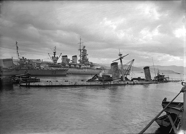 : IN SECONDO PIANO IL CACCIATORPEDINIERE ALFREDO ORIANI E LA NAVE DA BATTAGLIA VITTORIO VENETO