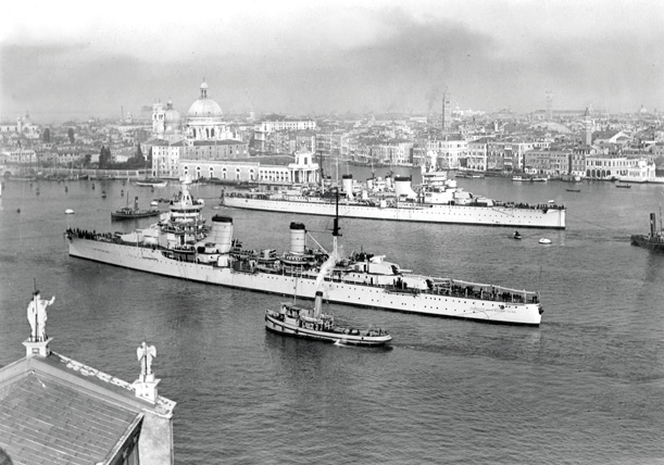 Note - Notes: Sullo sfondo, un'altra unità della classe "Condottieri" - in far distance, another "Condottieri" class cruiser.