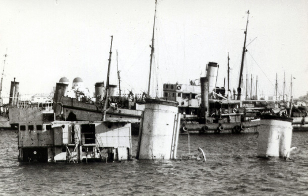 - The funnels and bridge of the destroyer Borea in the port of Bengasi in early 1941. The Borea had been sunk by British planes on 17 September 1940; the same day, near the port's entrance, the Aquilone was lost to mines probably launched in the same air raid during which the Borea was sunk. In the background, from left to right, a "Tre pipe" ("three funnel") torpedo boat, a small merchant ship, a tug and some motor sailers may be seen