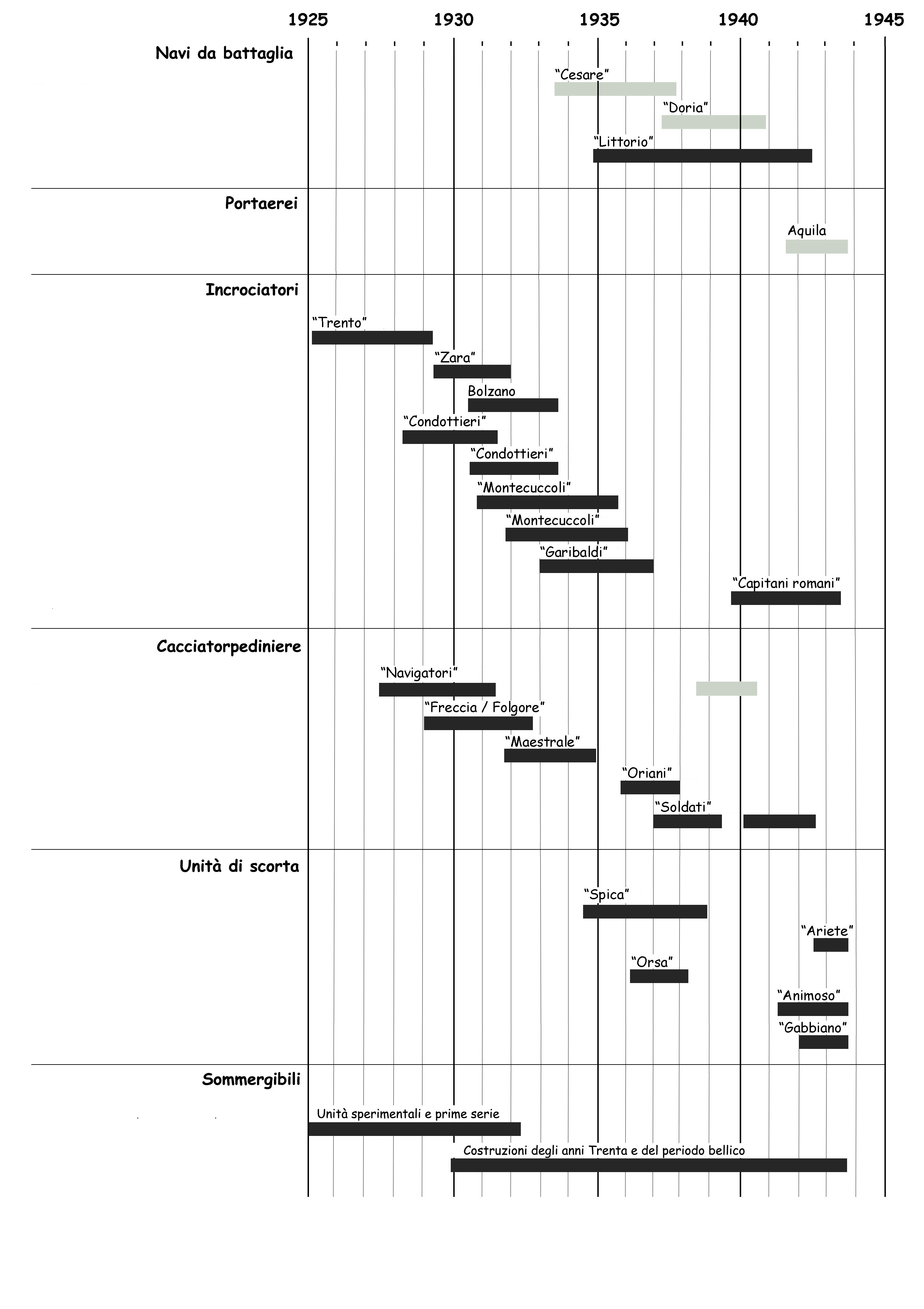 QUESTA TABELLA, PER IL PERIODO 1925-1945, RIPORTA L'ANDAMENTO DEI PROGRAMMI DI COSTRUZIONE DELLA REGIA MARINA PER LE UNITÀ DI SUPERFICIE E PER I SOMMERGIBILI. SI NOTI CHE, TRA IL 1925 E IL 1935, FURONO NUMEROSE LE CLASSI DI INCROCIATORI E CACCIATORPEDINIERE IMMESSI IN SERVIZIO; PER IL PERIODO 1935-40, INVECE, LA MAGGIOR PARTE DELLE RISORSE FINANZIARIE FU ASSEGNATA ALLA COSTRUZIONE DELLE NAVI DA BATTAGLIA TIPO "LITTORIO", CON UNA CONSEGUENTE RIDUZIONE DEI FONDI DESTINATI AD ALTRI TIPI DI UNITÀ. LE AREE NERE INDICANO LA COSTRUZIONE DI NUOVE UNITÀ, E QUELLE GRIGIE LA MODERNIZZAZIONE (O LA RICOSTRUZIONE) DI ALCUNE CLASSI O DI SINGOLE NAVI. (M. BRESCIA)