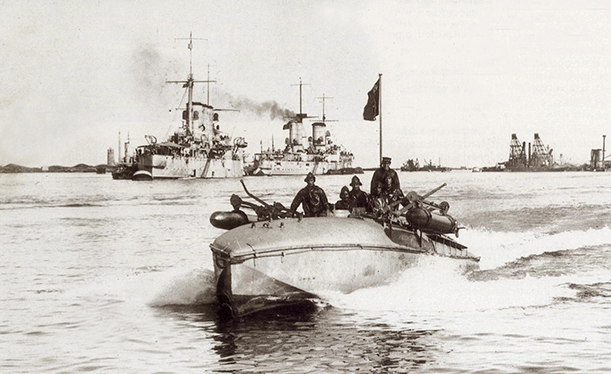 NOTA-NOTE:UNA DELLE PIÙ FAMOSE IMMAGINI NAVALI DELLA GRANDE GUERRA: IL MAS 7, AL COMANDO DEL T.V. GENNARO PAGANO DI MELITO, A BRINDISI NELL'ESTATE DEL 1916. LE NAVI SULLO SFONDO SONO, DA SINISTRA A DESTRA, GLI INCROCIATORI CORAZZATI PISA E SAN GIORGIO E - ALL'ESTREMA DESTRA - LA NAVE SALVATAGGIO ANTEO IMPEGNATA NEL RECUPERO DELLA CORAZZATA BENEDETTO BRIN, AFFONDATA PER SABOTAGGIO IL PRECEDENTE 27 SETTEMBRE 1915.