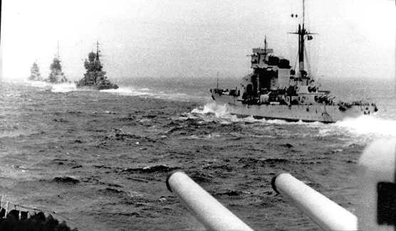 L’IMMAGINE RIPRENDE PER L'ULTIMA VOLTA I TRE INCROCIATORI PESANTI TIPO "ZARA" PRIMA DELLA LORO PERDITA NELL'AZIONE NOTTURNA DI MATAPAN. DA SINISTRA A DESTRA, ZARA, POLA, FIUME E DUCA DEGLI ABRUZZI). IL FIUME, CHE DA POCHI GIORNI ERA STATO MIMETIZZATO CON UNO SCHEMA SPERIMENTALE A CHIAZZE DI VARIO COLORE, APPARE PIÙ SCURO, DELLE ALTRE UNITÀ.