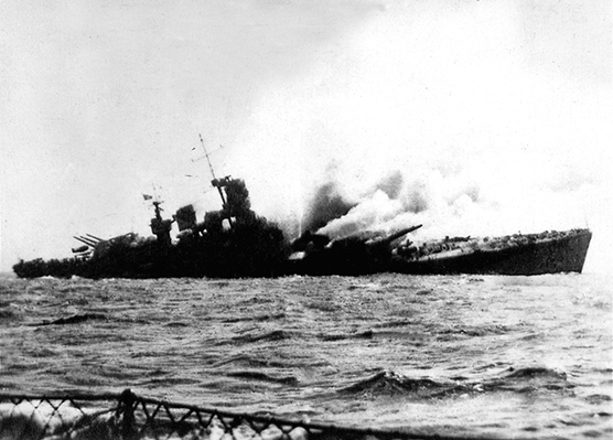 _ L'IMMAGINE MOSTRA L'UNITA' INCLINATA A SINISTRA DOPO ESSERE STATA COLPITA DALLA SECONDA BOMBA PLANANTE RADIOGUIDATA PC.1400 X, LANCIATA DA UN VELIVOLO TEDESCO. DA NOTARE LA MANCANZA DELLA TORRE SOPRAELEVATA PRODIERA, LANCIATA A CENTINAIA DI METRI DI DISTANZA DALL'ESPLOSIONE CHE HA DEVASTATO I DEPOSITI MUNIZIONI PRODIERI.