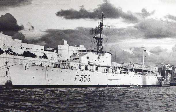 Between 1951 and 1954 the Grecale was refitted as an antisubmarine frigate, with improved a/a weapons and electronics; she was rebuilt again in 1959-1960 as a command ship, disembarking all armament minus a twin 40 mm Bofors light a/a gun mount. The forecastle was extended aft, thus incorporating the aft deckhouse, a new bridge was fitted and a Combat Information Center (Centrale Operativa Combattimento) and extra inner command areas were now found inside the hull. In this photograph, Grecale is shown in 1963 at Malta: she operated as a command ship until 1964, and she was stricken and broken up in 1965.
