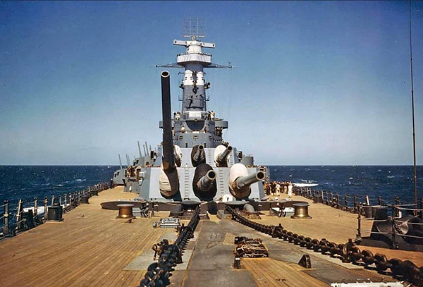 Note - Notes: IMMAGINE ORIGINALE A COLORI DELL'EPOCA CHE RAFFIGURA IL PONTE DI COPERTA, IL GRUPPO DI FUOCO PRODIERO E IL TORRIONE DELLA NAVE DURANTE LA "SHAKEDOWN CRUISE".