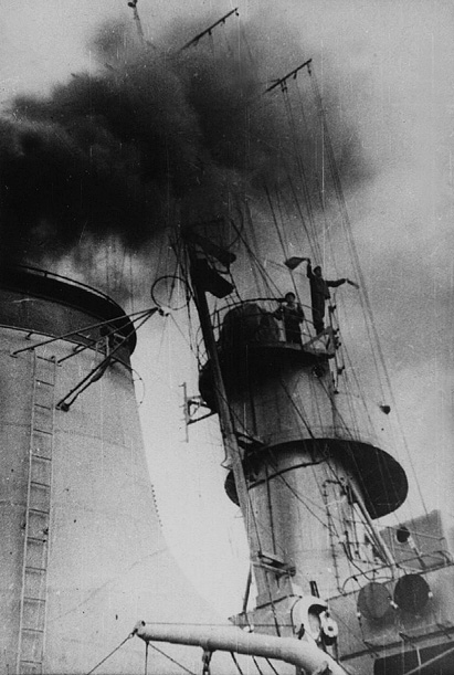 Note - Notes: Segnalatori dell’equipaggio del Tashkent all’opera sulla sommità dell’alta struttura a sezione ellittica, a poppavia della SDT, sul cielo della controplancia. (g.c. E. Zelikov)