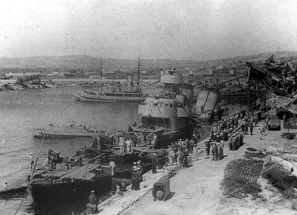 Note - Notes: Novorossijsk, primavera 1944: una foto scattata durante le fasi iniziali dei lavori di recupero del Tashkent. (g.c. E. Zelikov)