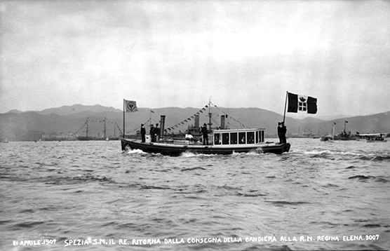 - LA FOTO RIPRENDE IL MOTOSCAFO CON A BORDO V. EMANUELE III AL TERMINE DELLA CERIMONIA DELLA CONSEGNA DELLA BANDIER ADI COMBATTIMENTO.