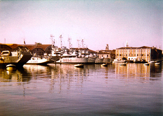 Note EX LSSL USA - 5 UNITA' DELLA LA CLASSE "CANI" O "ALANO" ORMEGGIATI DI PUNTA.IN PRIMO PIANO IL MOTO TRASPORTO COSTIERO MTC 1005 ( A5345).