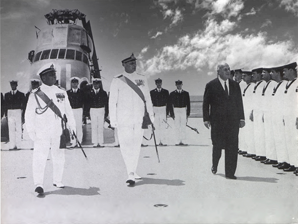 Note -Notes: 4-01 (80163) SUL PONTE DI VOLO DELL'INCROCIATORE ANDREA DORIA (C 553) IN OCCASIONE DELLA VISITA DELL'AMBASCIATORE D'ITALIA DOTT. FILIPPO MUZI FALCONE DURANTE LA CROCIERA IN ESTREMO ORIENTE (PERIODO AGOSTO-DICEMBRE 1964).