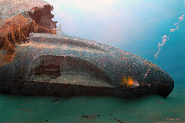 Nome- Name: SZENT ISTVÁN (RAPPRESENTAZIONE PITTORICA DELLA PRORA DEL RELITTO IN 3D, NOTARE LE PROPORZIONI CON IL SUB)