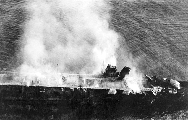 Note - Notes: L'UNITA' NAVALE IN FIAMME E CON IL PONTE DI VOLO GRAVEMENTE DANNEGGIATO. AFFONDERÀ ATTORNO ALLE 09.00.