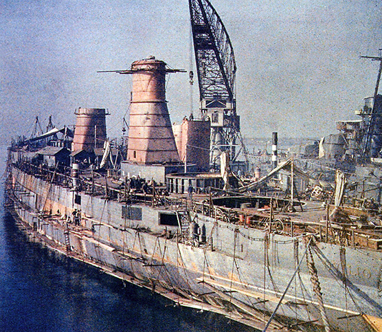 - LA NAVE DA BATTAGLIA DUILIO IN ALLESTIMENTO IN UNA RARA LASTRA A COLORI ORIGINALE DELL’EPOCA.(G.C. “STORIA MILITARE)