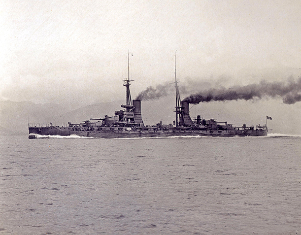 - LA NAVE DA BATTAGLIA DUILIO AD APRILE 1915, DURANTE LE PROVE DI MACCHINA SULLA BASE MISURATA PUNTA CHIAPPA /ISOLA DEL TINO, POCO PRIMA DELLA CONSEGNA ALLA REGIA MARINA AVVENUTA IL10 MAGGIO 1915.( G.C. “STORIA MILITARE)