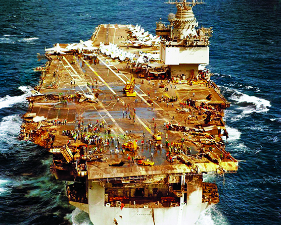 UN RAZZO “ZUNI” DI UN CACCIABOMBARDIERE F-4 PHANTOM II ESPLOSE ACCIDENTALMENTE A BORDO DELLA PORTAEREI IMPEGNATA IN UN CICLO DI ESERCITAZIONI NELLE ACQUE DELLE ISOLE HAWAII, PROVOCANDO, DI SEGUITO, ALTRE DICIOTTO ESPLOSIONI DI NUMEROSE BOMBE E RAZZI DI CUI ERA IN CORSO L’IMBARCO SU ALTRI VELIVOLI.
